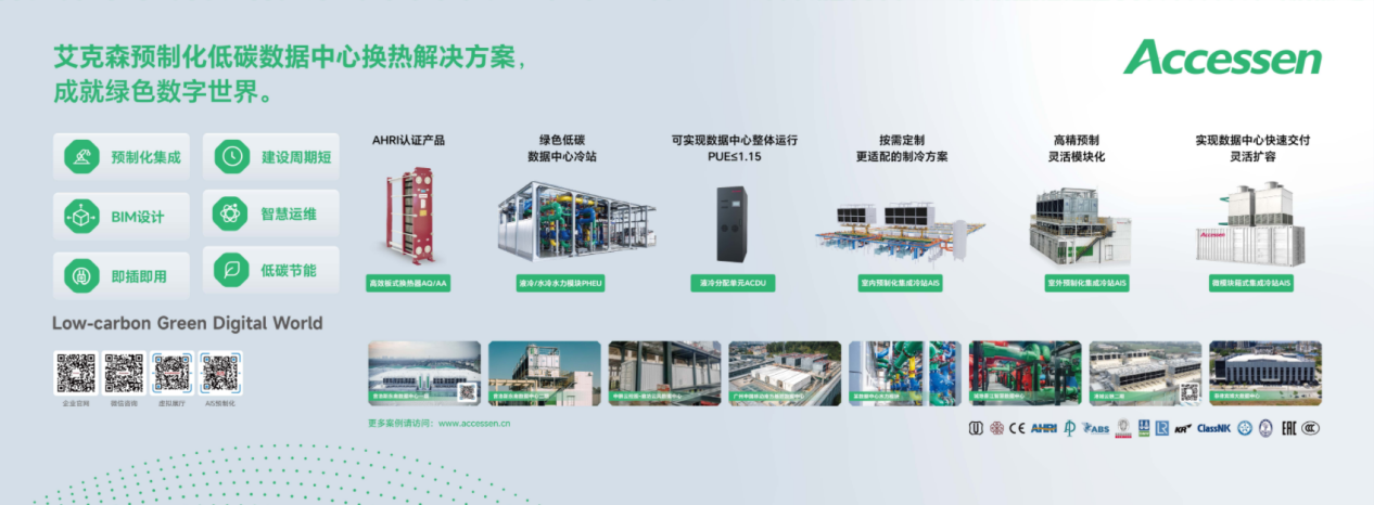 艾克森预制化低碳数据中心换热解决方案,结合艾克森在换热领域近二十多年产品技术和应用经验,提供水冷和液冷的产品系列涵盖了预制化集成冷站、AHRI认证高效板式换热器、液冷水力模块、液冷分配单元等核心产品组合,深度解析设备在能效提升、快速部署、安全运维、绿色低碳等维度的技术优势,助力数据中心客户突破传统、不断创新迭代实现数据中心可持续发展。