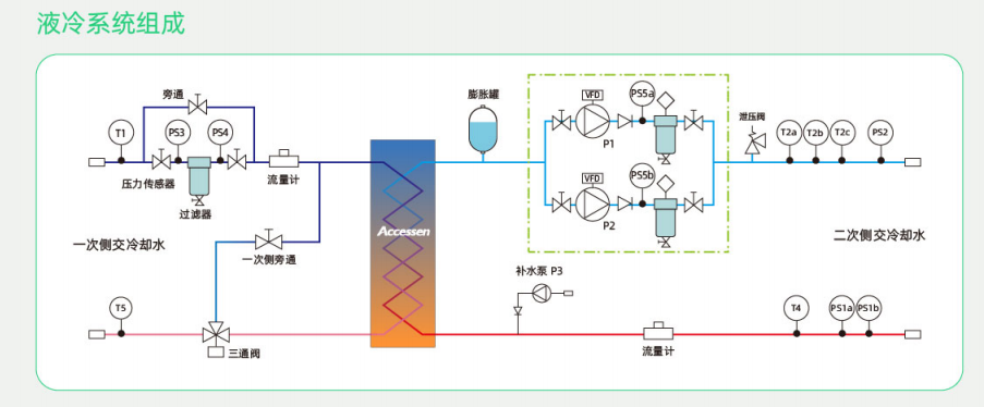艾克森研发生产的ACDU采用液-液换热模式,适用于冷板式液冷服务器、浸没式液冷池/柜等散热场景,可实现数据中心整体运行PUES1.15。冷却液在负载中吸热后返回液冷源装置,由装置内液泵提升压力,通过外置换热器与一次侧冷却水进行换热,降温后的冷却液通过管路再进入负载,如此循环,从而带走负载内热量,保证负载在一个良好的环境下工作,液冷CDU模块是高算力数据中心和智算中心的更好选择。
