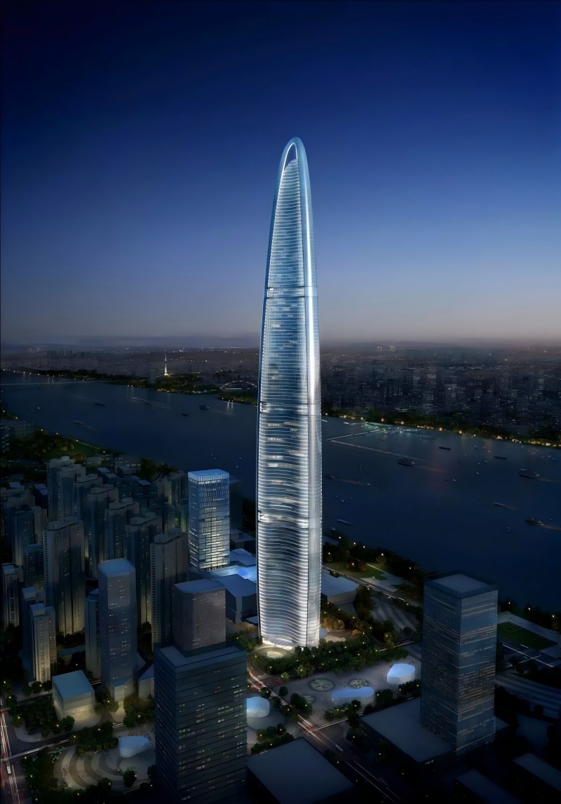 武汉绿地中心(Wuhan Greenland Center)是中国第一、全球第二高的超高层摩天大楼,由曾主持设计迪拜塔、上海金茂大厦等多个世界著名超高层的建筑设计团队——美国AS+GG建筑设计事务所设计建造,作为武汉绿地国际金融城项目的核心部分,位于武昌滨江商务区CBD核心区,与汉口百年外滩隔江相望,总建筑面积约300万平方米,总投资逾300亿元。集超五星级酒店、高档商场、顶级写字楼和公寓等于一体的超高层城市综合体,将由泰国正大集团、美国万豪酒店集团分别负责高档商场和白金五星级酒店的运营。大楼主塔底座俯视图成“三瓣形”,是武汉三镇地势的抽象化体现,主塔外观呈流线型,下粗上细,顶部是一个光滑的穹体。
